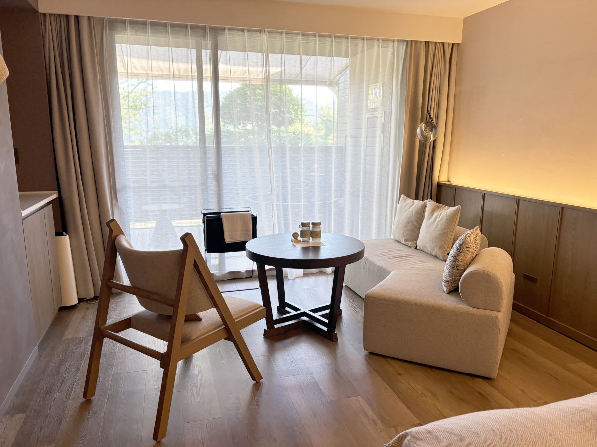 リビングスペースには、テーブルを囲んでチェアと2〜3人がけのソファがあり、畳のスペースとはまた違うおしゃれさ。こちらでも旅の特別な時間をゆったり満喫できそうです。