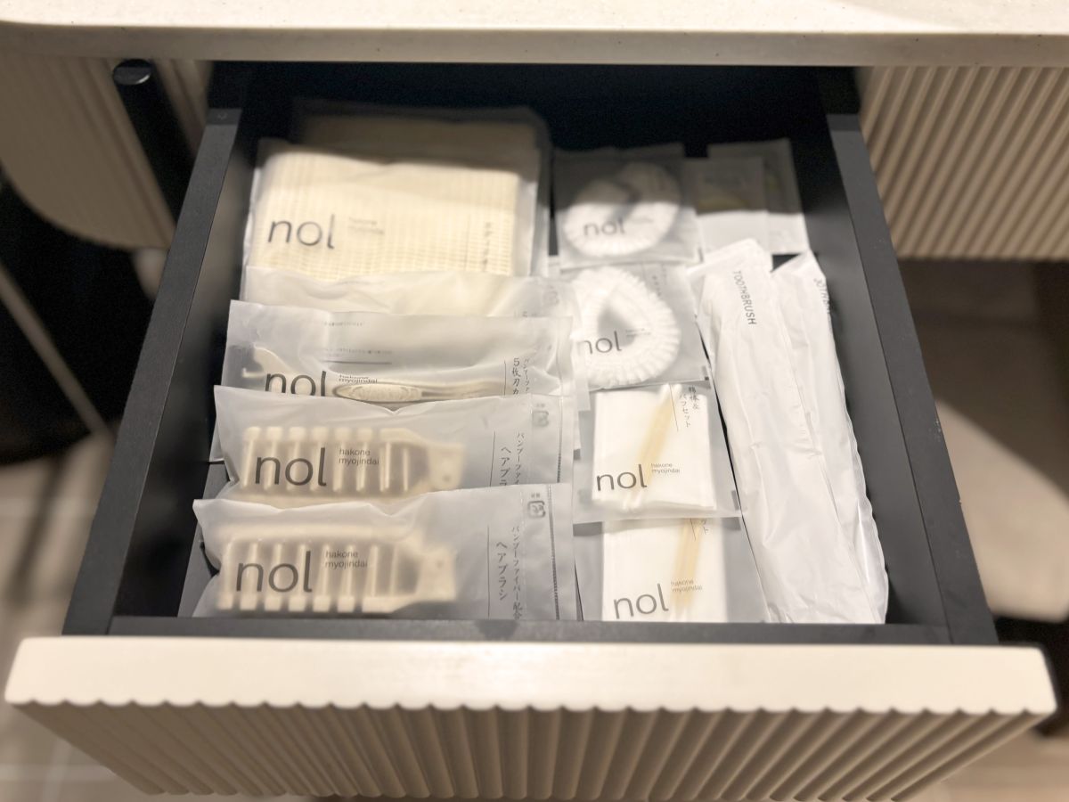 カウンターには、スキンケアセットのアメニティが置いてあるので、忘れずにもらっておきましょう!
