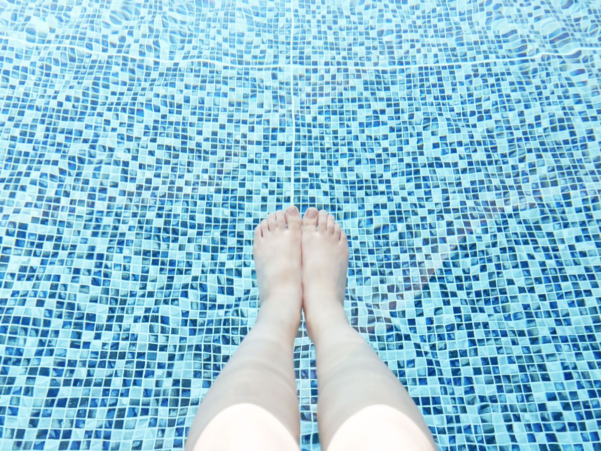 プールはぬるめの水温で、途中で寒くなりすぎる心配もありません。さらっとした温泉の肌あたりが心地いいので、ずっとプールにいたくなります! さわやかなブルータイルの床にもテンションが上がります。