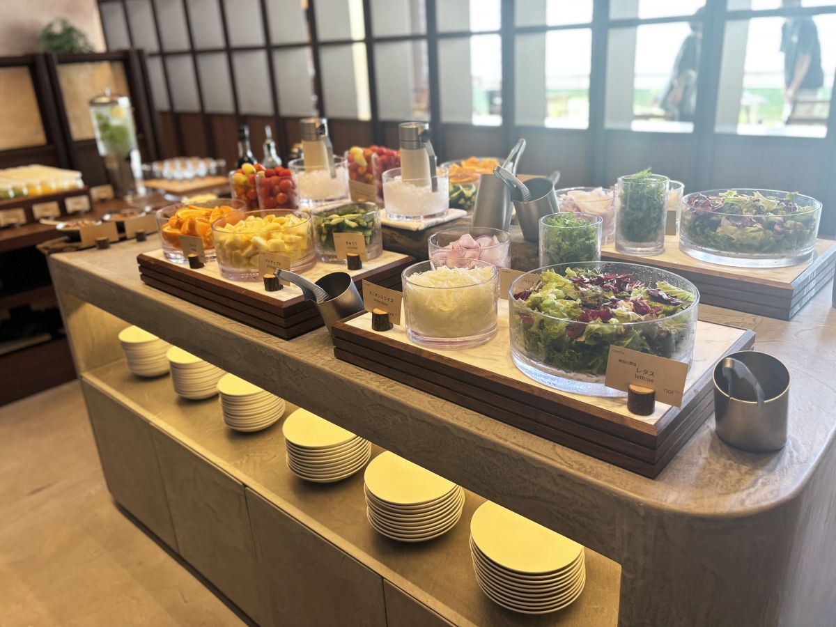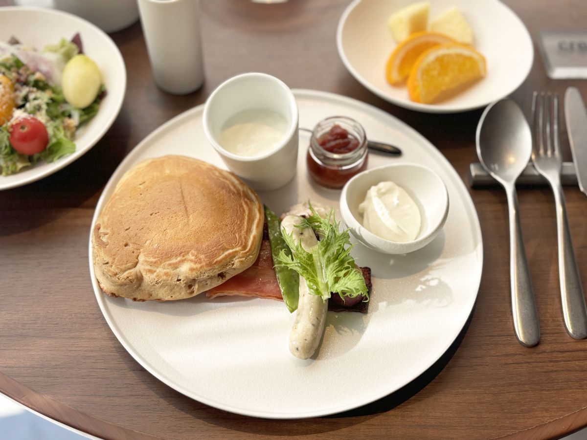 今回いただいたプレートには、パンケーキをメインに、小田原の有名店「鈴廣かまぼこ」のシーセージ、野菜のグリル、ポテトサラダ、ヨーグルトなどがのっています。栄養満点のプレートで、朝から優雅な時間を過ごせます。