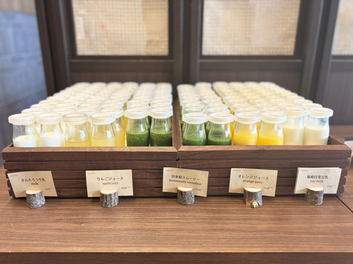 かわいい瓶に入ったこちらは、スムージーをはじめとしたドリンク。自家製スムージーや、子どもでも飲めるジュースのほか、神奈川県産生乳を100%使用した「きんたろう牛乳」、コクのあるなめらかな口当たりの「箱根白雪豆乳」などが並んでいます。