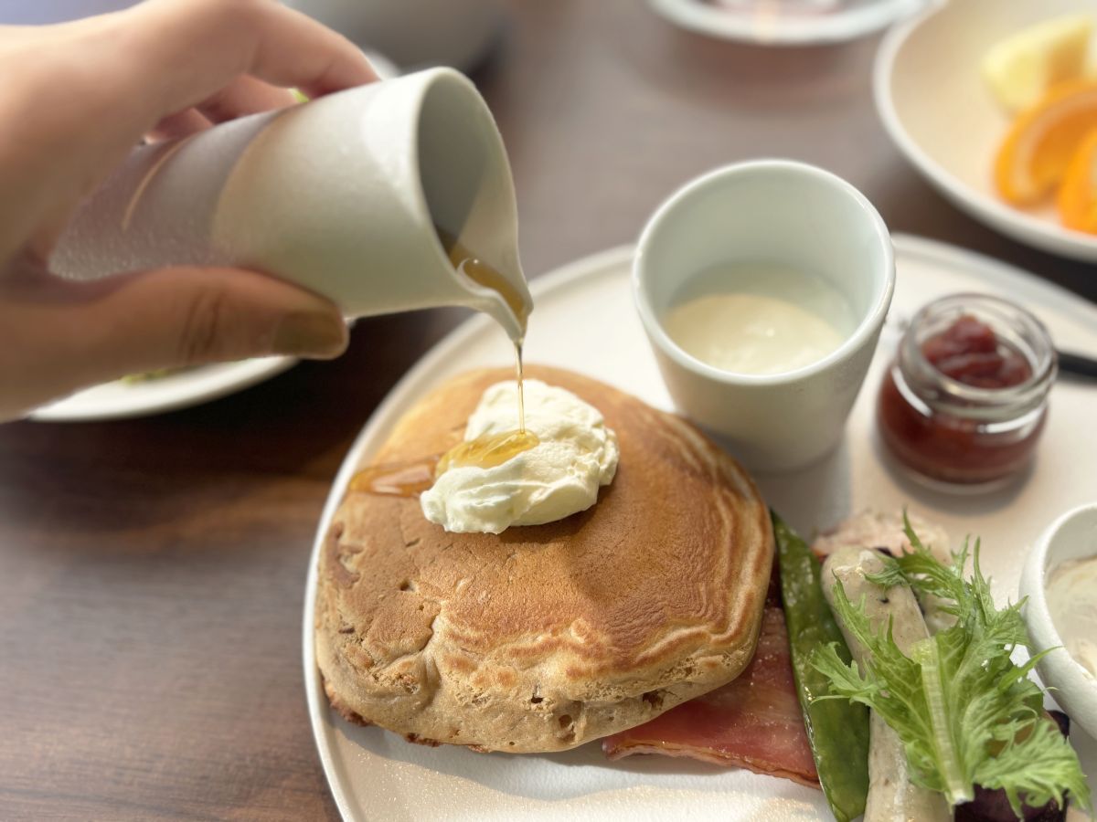 全粒粉を使用したパンケーキは、マスカルポーネを使用したホイップクリームとシロップでいただきます。ふわっと軟らかく、密度の高いしっかりした生地で、ぺろっと食べられるけれど満足感は抜群。