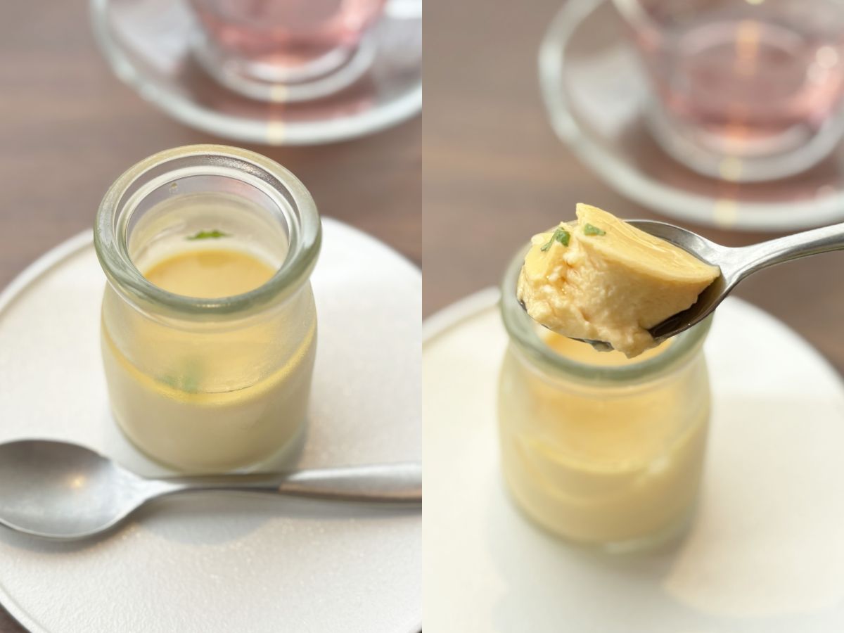 卵の風味を感じられる濃厚な味わいで、舌にのせるととろっと溶けるレア食感。さっぱりとしたミントシロップとの相性は抜群ながら、新感覚の味に出合えます。
