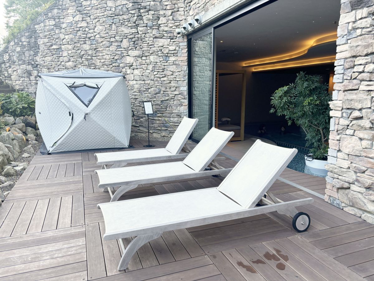 「サーマルプール」や「サーマルルーム」を楽しんだら、「ととのいテラス」で小休憩。プールの外のウッドデッキには、ゆったり休めるテラススペースがあるんです。