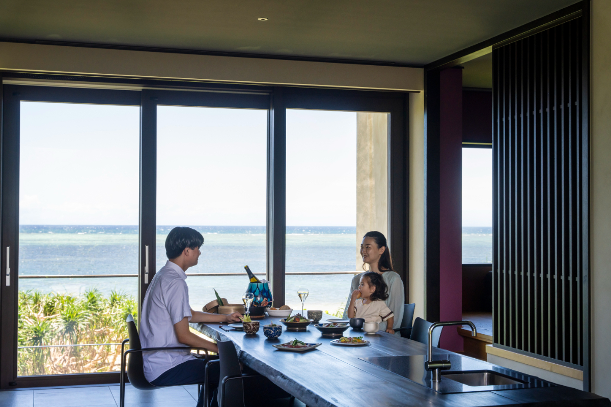 客室は、全室オーシャンフロントのスイートルーム。ダイニングには3ドアの大型冷蔵庫や電子レンジも備えていて、広々とした海に臨む客室で暮らすように過ごせます。複数家族での滞在には2部屋続きの客室アレンジにも対応。