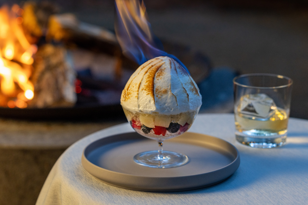 耳慣れない「焼き氷」ですが、クラッカーをイメージしたローズマリークランブルやチョコレートアイスクリームとともに、上からマシュマロに見立てたメレンゲをまとわせ、中にはモモやブルーベリーなどのフルーツがいっぱい♪ 仕上げに焚き火で白州ウイスキーを熱し、移した炎でかき氷をフランベすることで完成する、「星のや富士」でしか味わえないスイーツです。