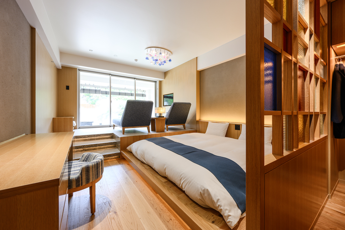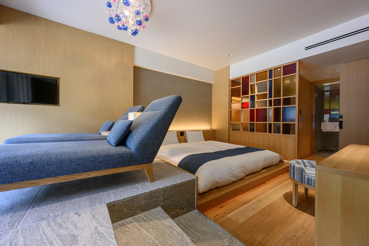 手前にあるベッドは「界」ブランドオリジナルの「ふわくもスリープ」。まるで雲の上にいるように、やさしく包み込む寝心地をイメージしているのだとか。