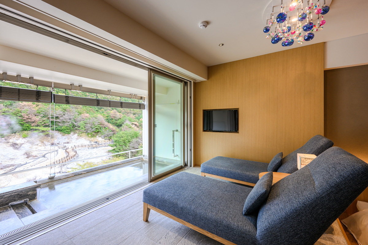露天風呂付き客室ではなく、あえての「客室付き露天風呂」という名称に、雲仙温泉を満喫してほしいという旅館の気概を感じませんか…! 部屋の半分がお風呂エリアなんてびっくり。開けた景色に向かって、温泉と湯上がりスペースが設置されています。