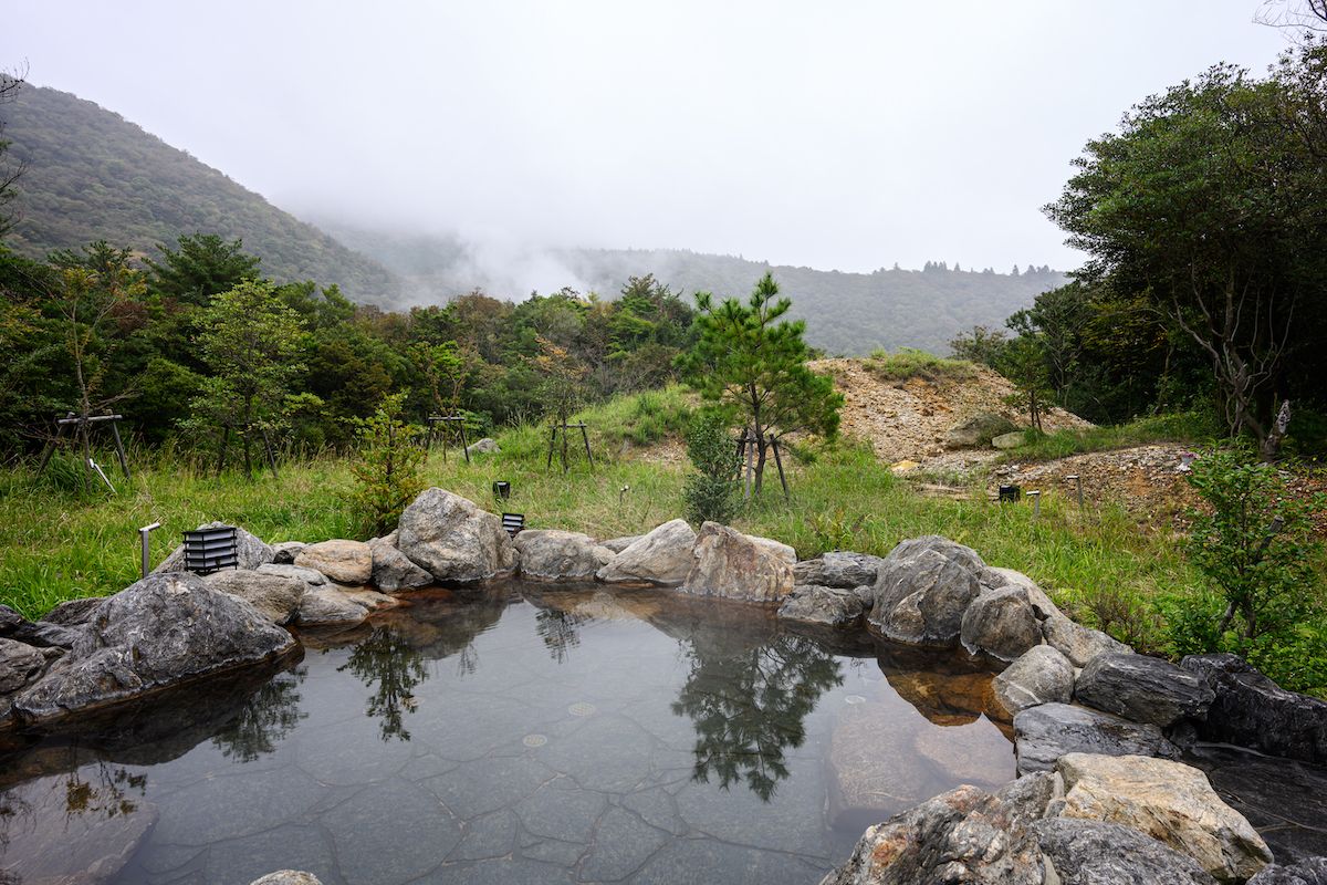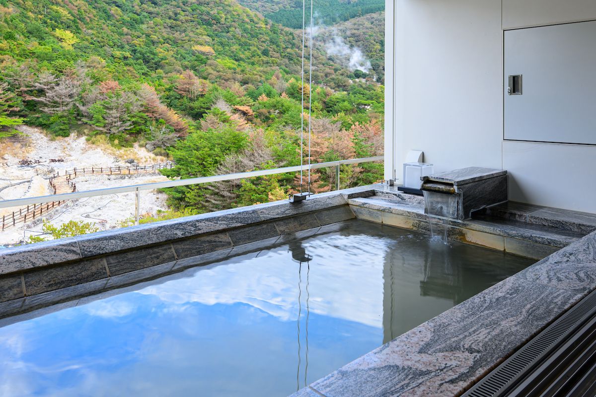 約5㎡の広々とした浴槽で、大浴場と同じ温泉が楽しめます。目の前にはところどころで湯けむりがあがる、雲仙地獄の雄大な山の風景が広がっています。硫黄がほんの少し香る空気感もあいまって旅情気分が盛り上がりそう。