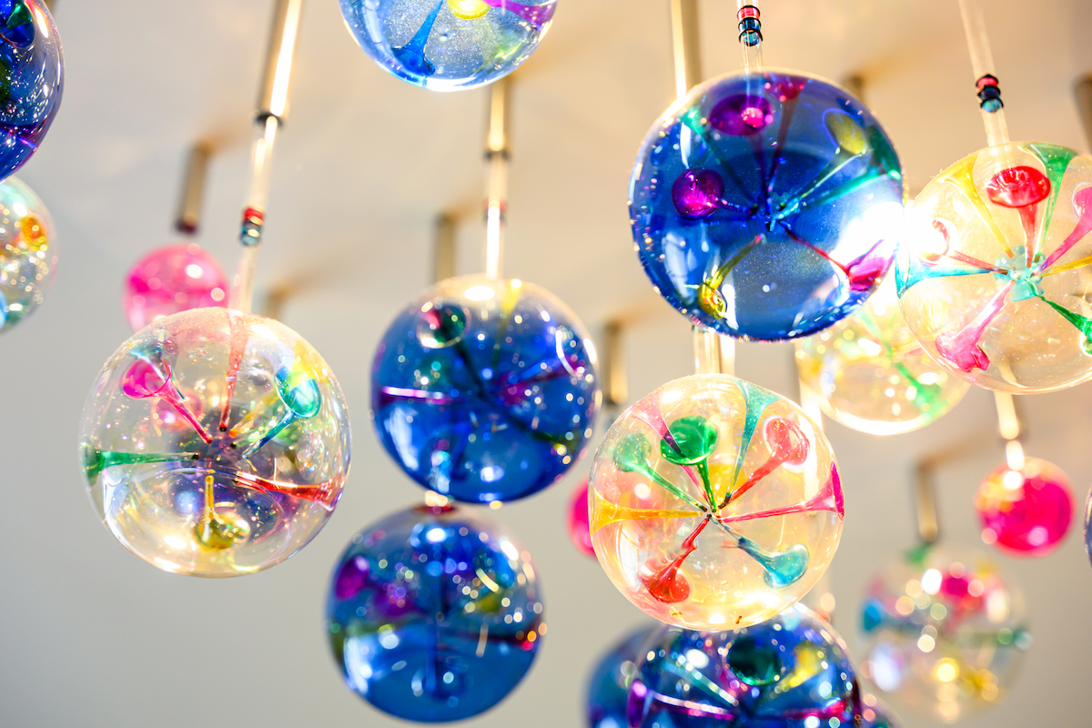 また、湯上がりスペースの上にある照明も素敵。長崎のおみやげでおなじみのビードロ(ポッペン)で作られたシャンデリアになっています。雲仙の硫黄の空気や水気で傷まないよう、特別な加工が施されたガラスでできている「界 雲仙」オリジナルのインテリアです。