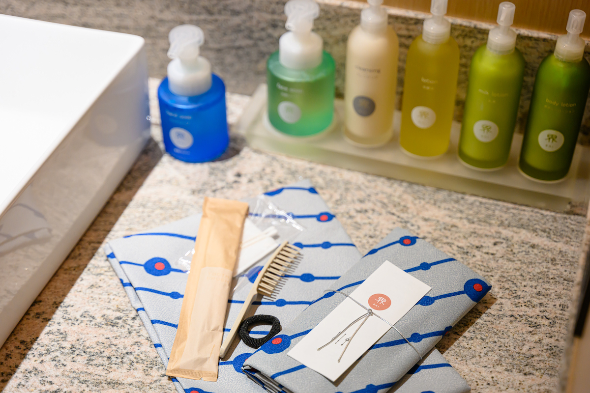 また、「界」では旅館ごとに違った色の風呂敷が用意されており、「界 雲仙」の風呂敷は「長崎凧の色」をモチーフにしているのだそう。中には歯磨きセット、 綿棒、コットン、ヘアゴム、ヘアブラシが入っています。