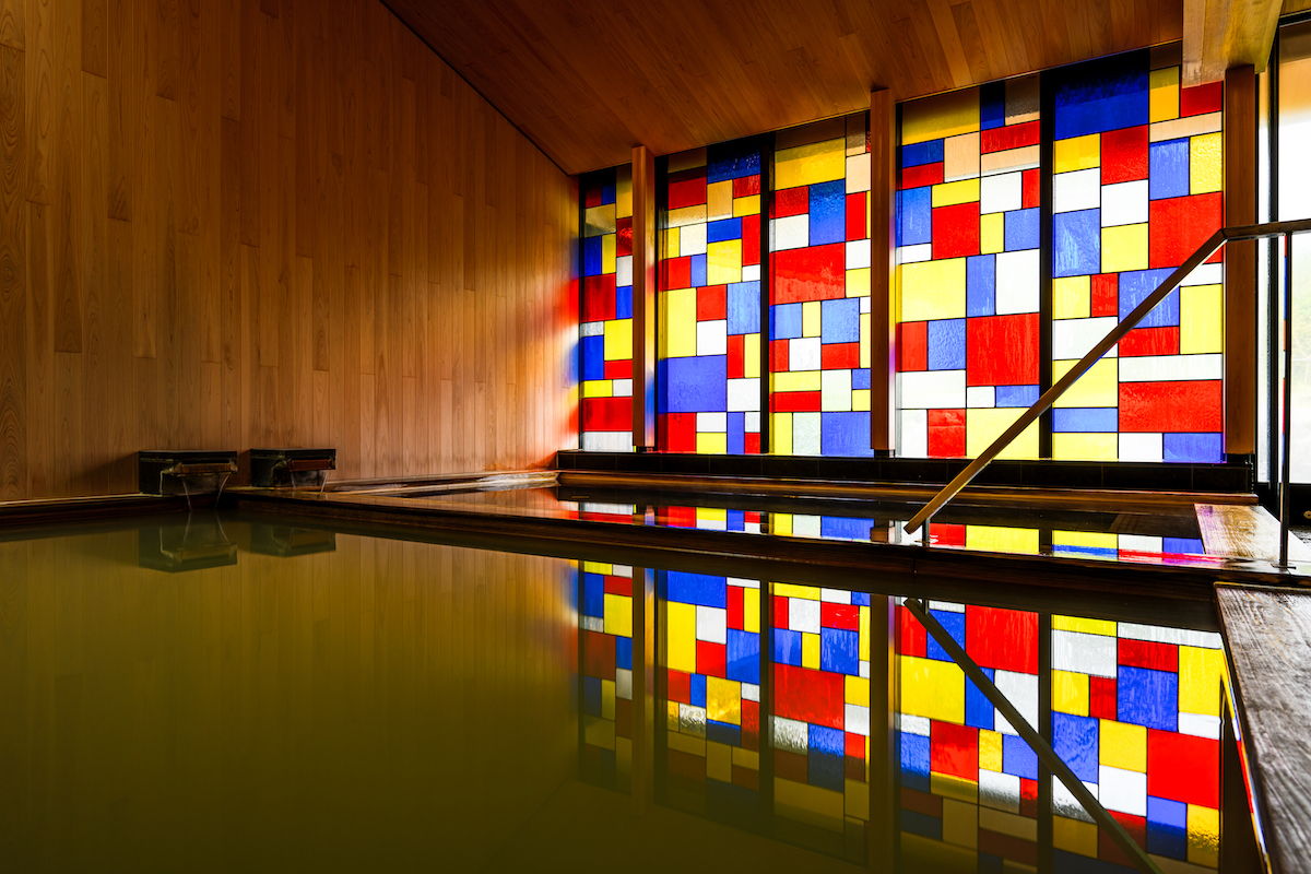大浴場はなんといっても色鮮やかなオランダのステンドグラスが施された内湯がインパクト大! 水面までカラフルな色に染まります。