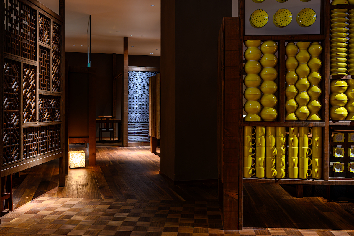 パーテーションは日本の焼き物をイメージしたものと、中国を連想させる模様、オランダを連想させるポップなガラスなどさまざまで、ここでも「和華蘭」の雰囲気が大切にされています。