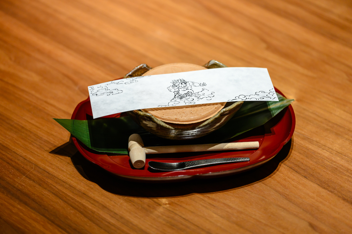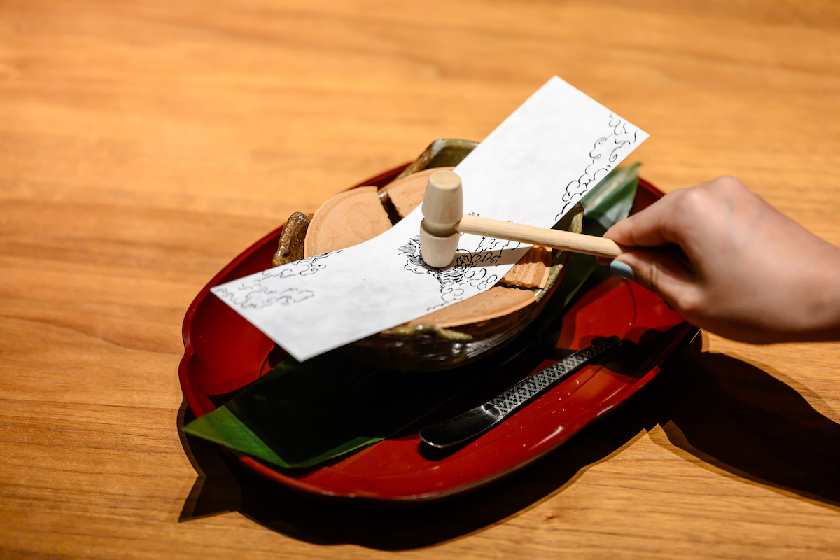最初に出てくるのは「ご当地先付け」。「界 雲仙」では「”鬼やらい”湯せんぺい 豚角煮リエット」がいただけます。1年の無事を願う鬼退治"鬼やらい"を疑似体験。鬼の絵めがけて小づちを振ります。
