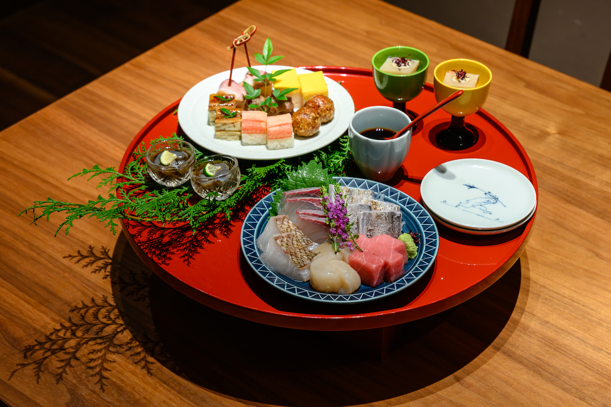 「宝楽盛り」は、卓袱(しっぽく)料理をイメージした華やかな赤い盆に置かれて登場。卓袱料理とは、中国や西欧の料理をアレンジした長崎発祥の宴会料理ことで、大皿に盛られたコース料理を、円卓を囲んで分け合って食べます。通常会席料理は1人前ずつ出されますが、この宝楽盛りは人数分載って運ばれてくるので、取り分けていただきましょう。