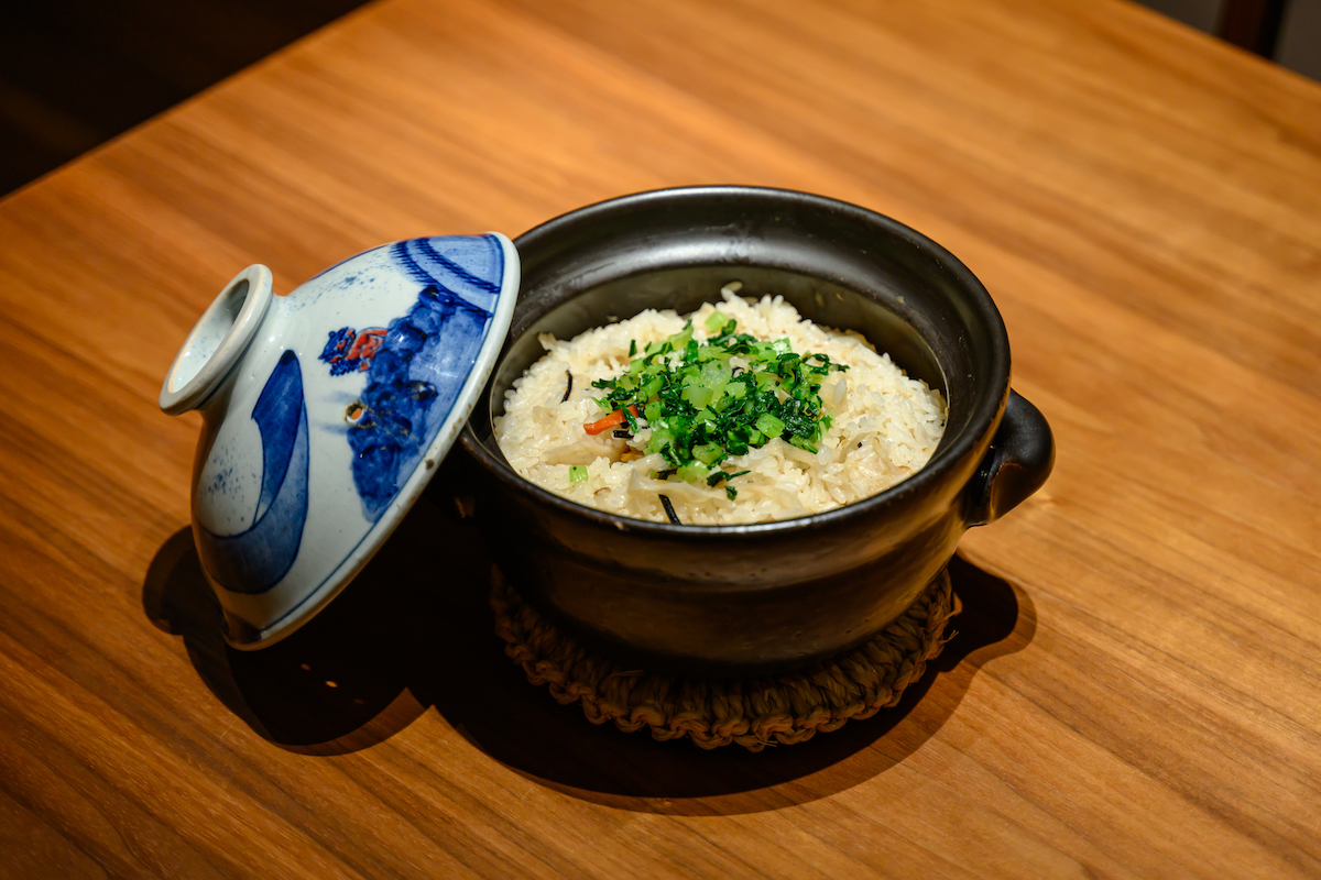 「五島三菜の土鍋ごはん」は、鬼がちょこんと描かれたかわいらしい土鍋が目で楽しませてくれます。「界 雲仙」のためにオリジナルで用意されたもので、火山灰を釉薬に使った雲仙焼です。鬼もおいしそうな香りにつられて戻ってきてしまったのでしょうか。