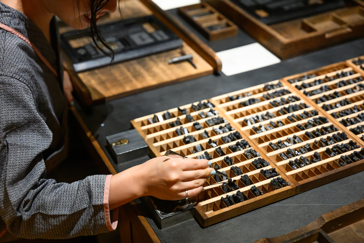 好きな文字をピンセットでひとつひとつ拾っていく作業に思わずどきどき。まるで書道をするような静かな緊張感のなかで、文字を刷ることの奥深さを垣間見ることができますよ。