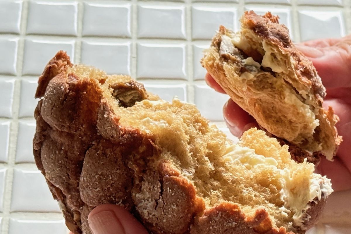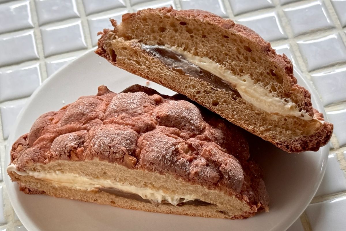 表面はメロンパン特有のホロホロとしたビスケット生地、その内側は気泡が入りつつも、少し噛みごたえのあるパン生地。そして中にサンドされている茶色いクリームがヘーゼルナッツコーヒークリーム、白いクリームがマスカルポーネ風味ホイップです。