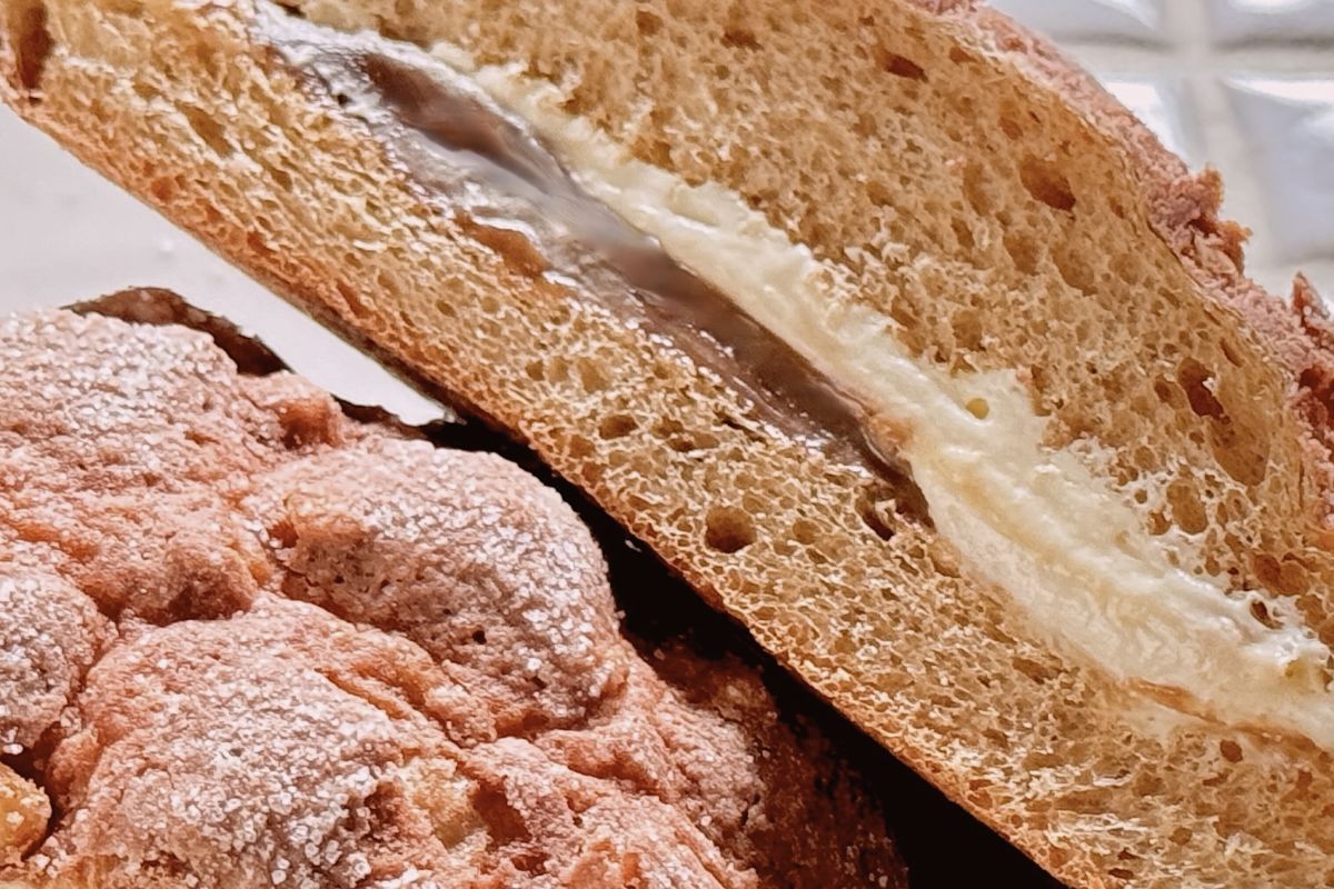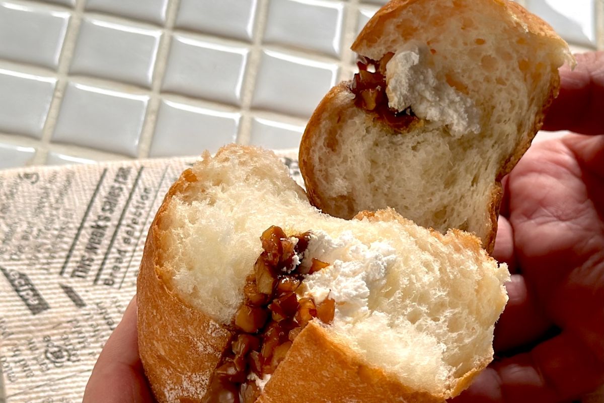 ビスケット生地は甘くて、ヘーゼルナッツ特有の香ばしくて豊かな味わいが特徴的です。コーヒー風味のパンに、ヘーゼルナッツコーヒークリーム、マスカルポーネ風クリームが、口の中で一体になって、甘くて、ほろ苦くて、まさにティラミスを彷彿させる味わい。へーゼルナッツが入ることで、個性的で豊かな味わいになっています。