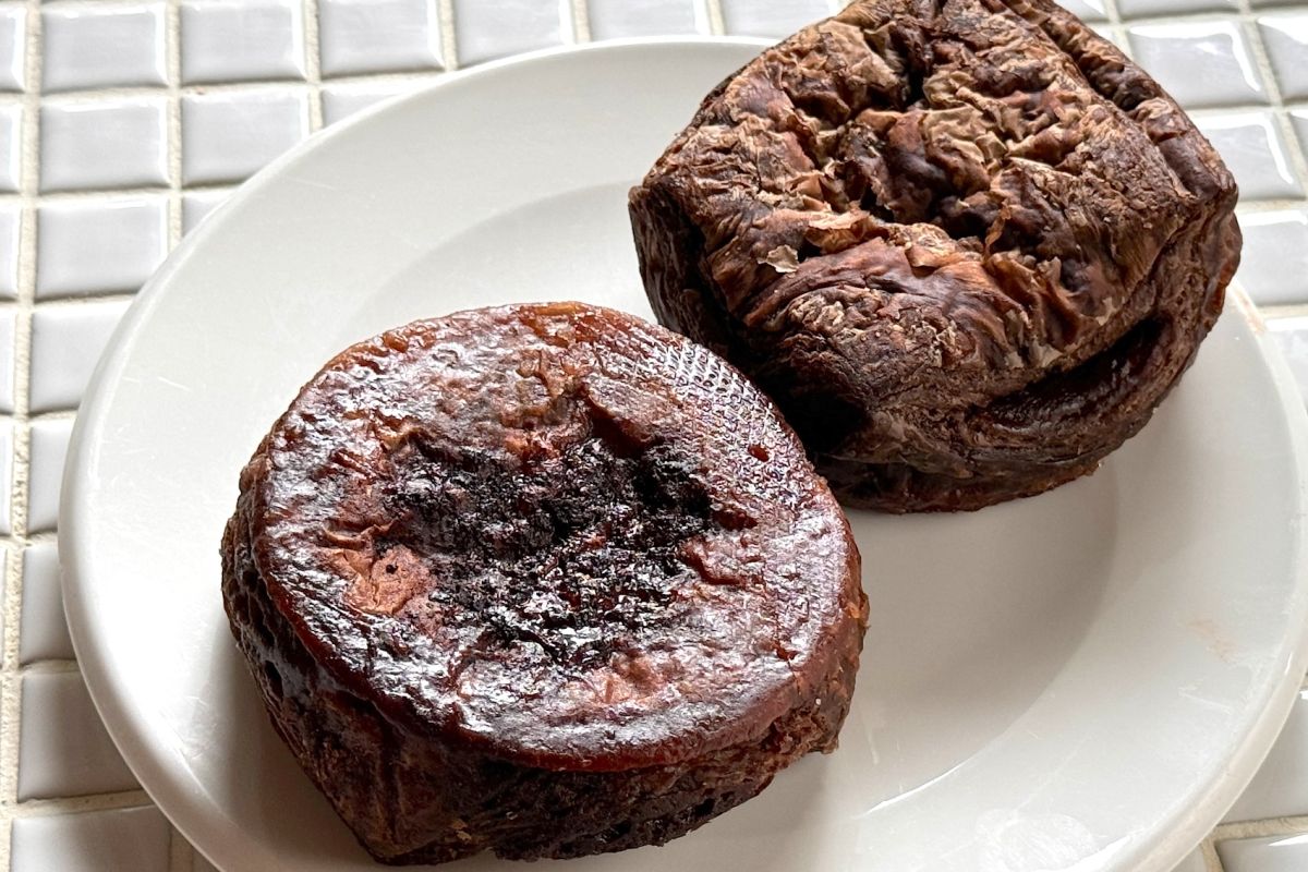 写真の左側がツヤツヤ&ザクザクした感じの表側。ひときわこげ茶色が濃くなっている中央が焼きチョコの部分、その周りがアメフィリングになっています。そして右側はその裏側。ふんわり&しっとりとしています。