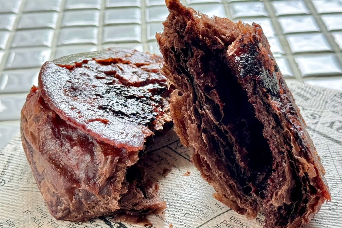 パン生地はエアリーで層になったチョコクロワッサン。中にはミルキーで濃厚なチョコクリームが入っていて、パンを噛み締めると口の中でジュワとそのクリームが広がります。そして表面の焼きチョコはビターな味わい、その周りはアメがけになっていてクイニーアマンのようにパリッ&ザクッ食感。塩味が甘さを引き立てています。