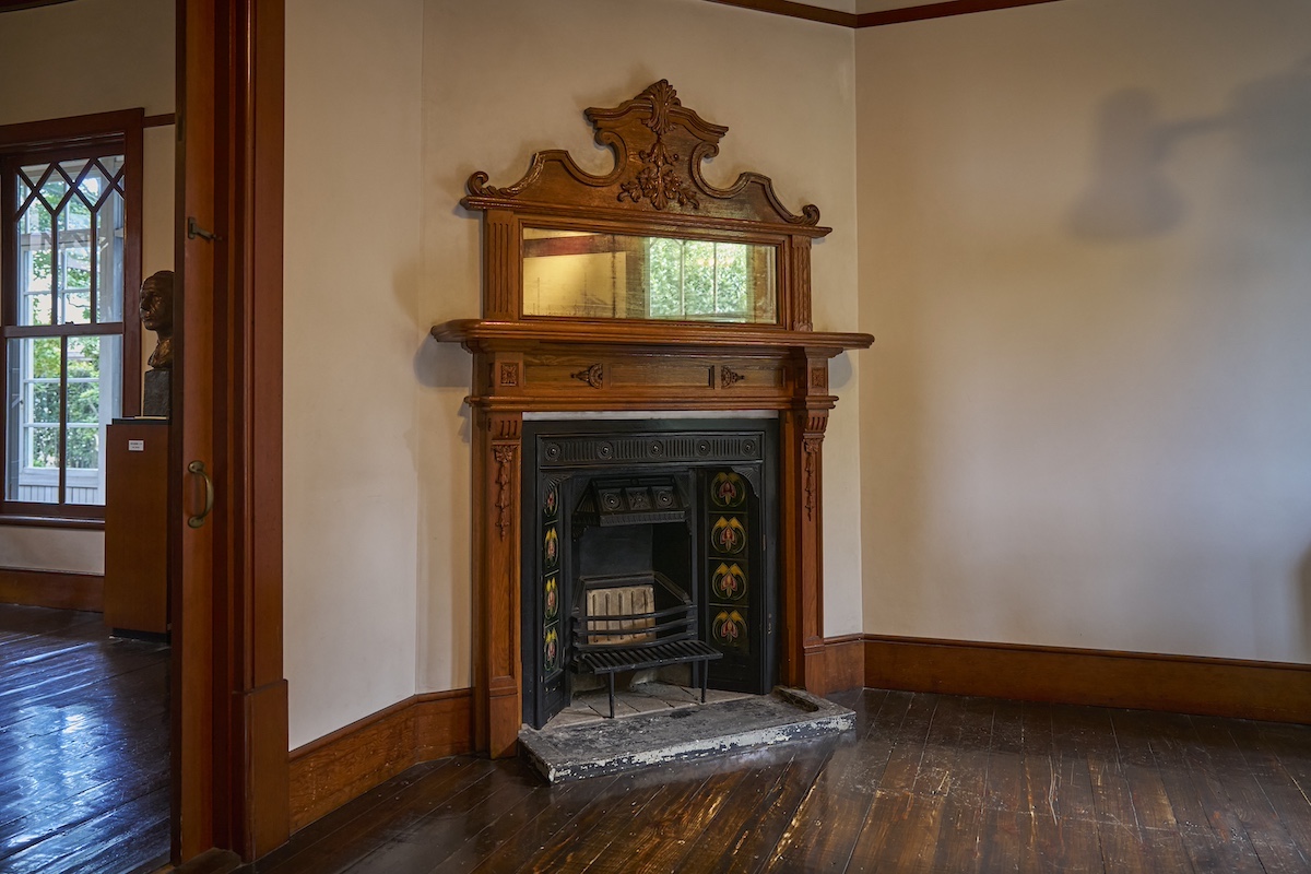 玄関のすぐ右側にはあるのは居間。お客様を招き入れる場所でもあるため、特に力を入れた造りになっています。なかでも目を引くのは、ケヤキ材を使った前飾りが華麗な暖炉。上部には鏡が埋め込まれていますが、これはアメリカではあまり見られない装飾で、材料をアメリカから輸入した後、日本人の大工が追加で組み込んだのではないかと考えられています。