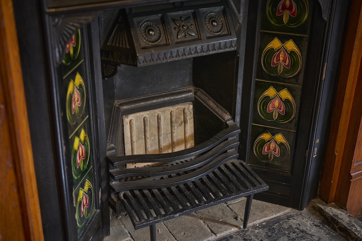 縁を飾るタイルはアール・ヌーヴォー様式。アメリカで愛や豊かさの象徴とされていた蘭の花のデザインがとてもシックです。ちなみに暖炉は館に6機あり、それぞれ建物の中心部に寄せて配置されており、煙突が1本で済むよう工夫されているそうです。