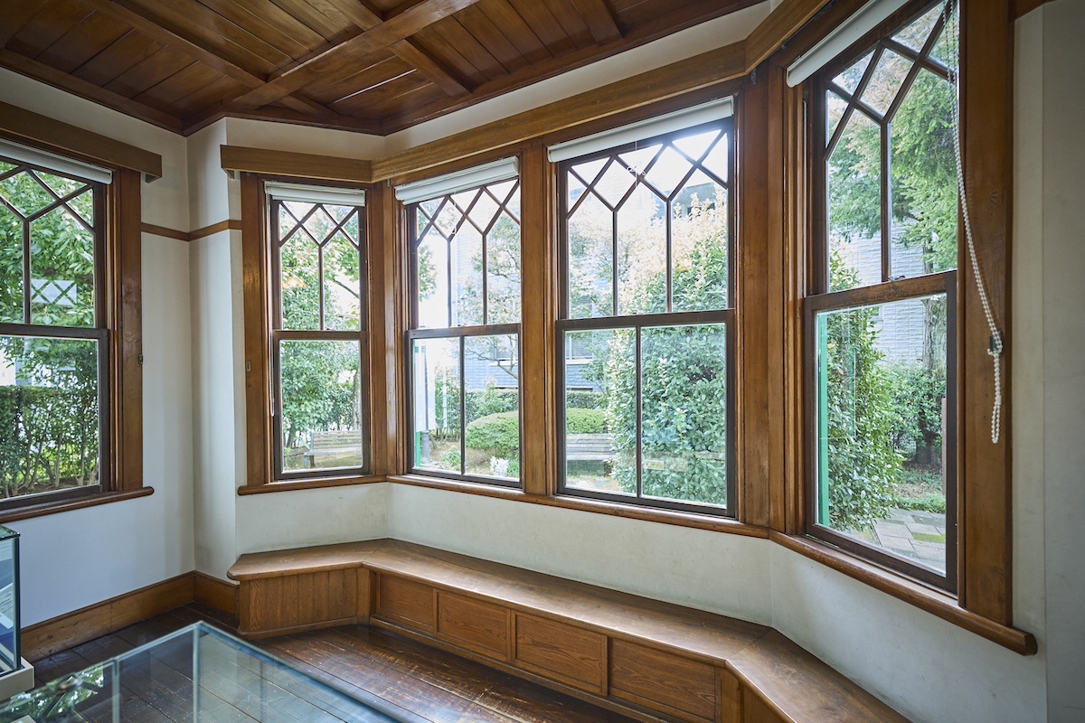 光のたっぷり入るベイウィンドウ(張り出し窓)。下にあるベンチは、収納戸棚にもなっていました。生活の場であったことが感じられますね。