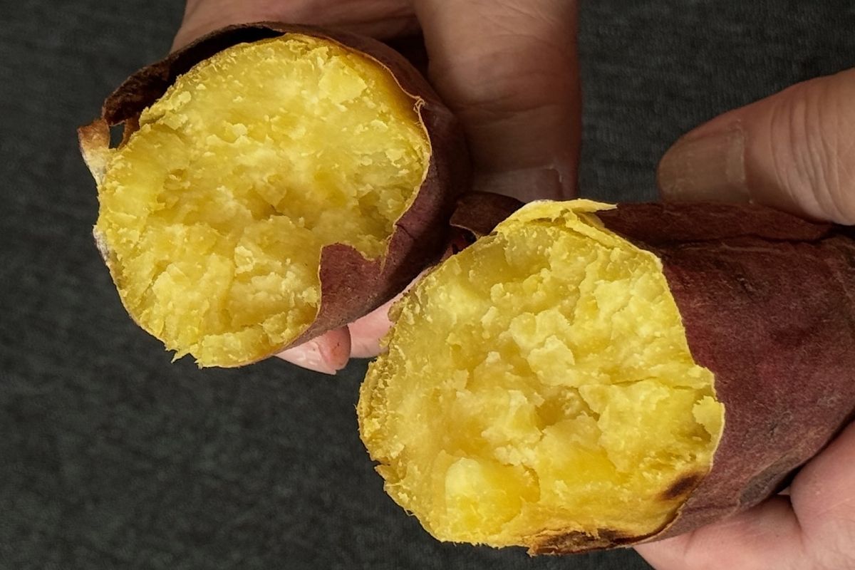 ほかほかの焼きいもを割ってみると、ご覧の通り、鮮やかな黄色。