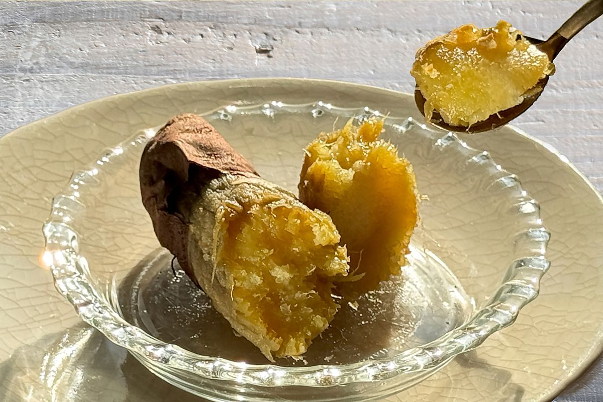 「焼きいも」に使用されるサツマイモは、収穫後およそ1カ月間貯蔵することで、サツマイモに含まれる“でんぷん質”の“糖化”をうながし、甘み(糖度)としっとり食感につながる粘りを高めているそうです。店舗の専用オーブンで石焼きにすることで、香り豊かで甘さが引き立つ焼きいもに仕上がっています。