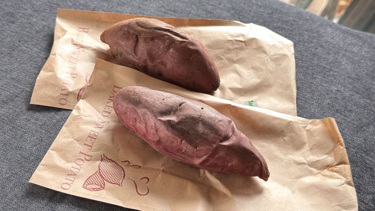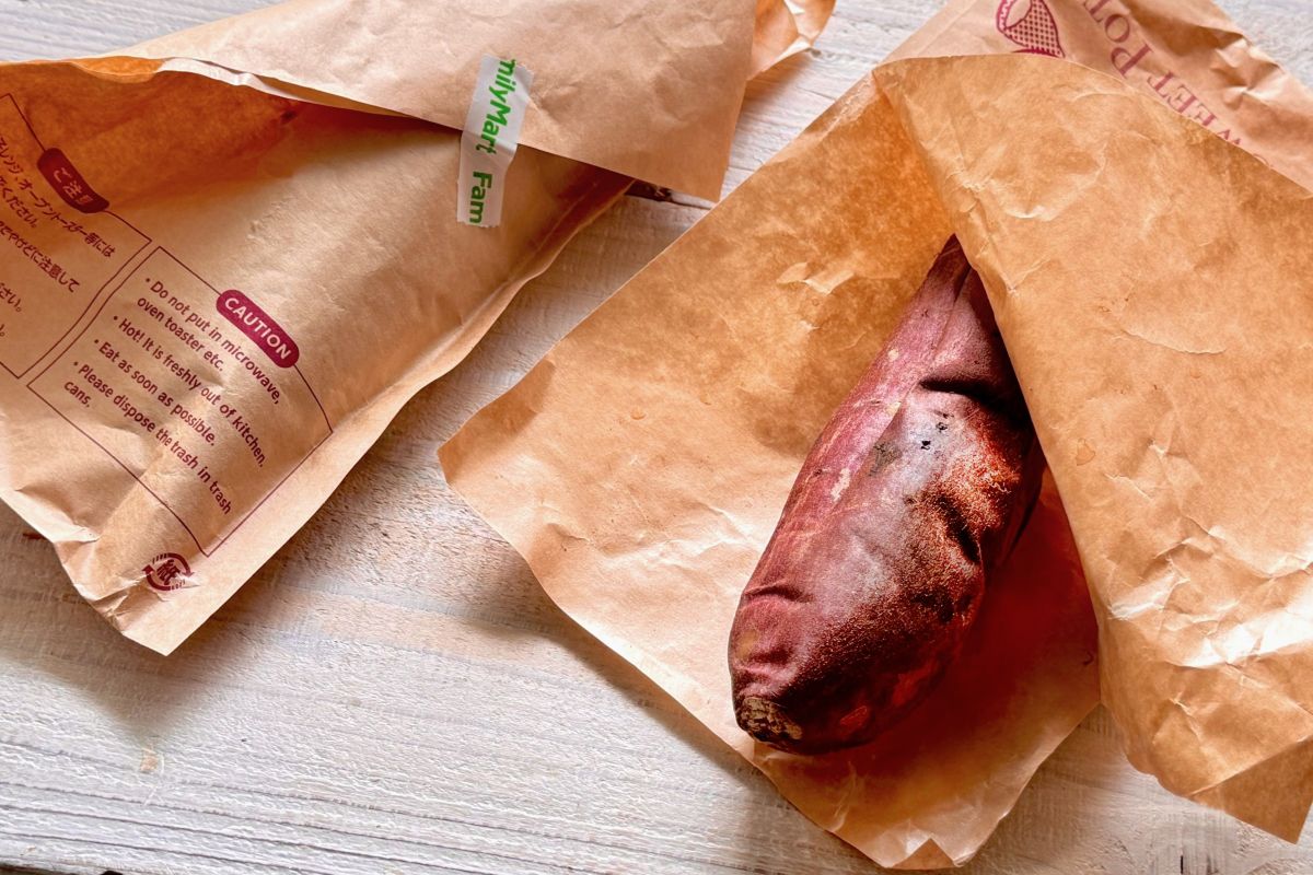 カウンターで「焼きいも」を購入すると、茶色い紙に包んだ状態で渡されます。ホカホカです。