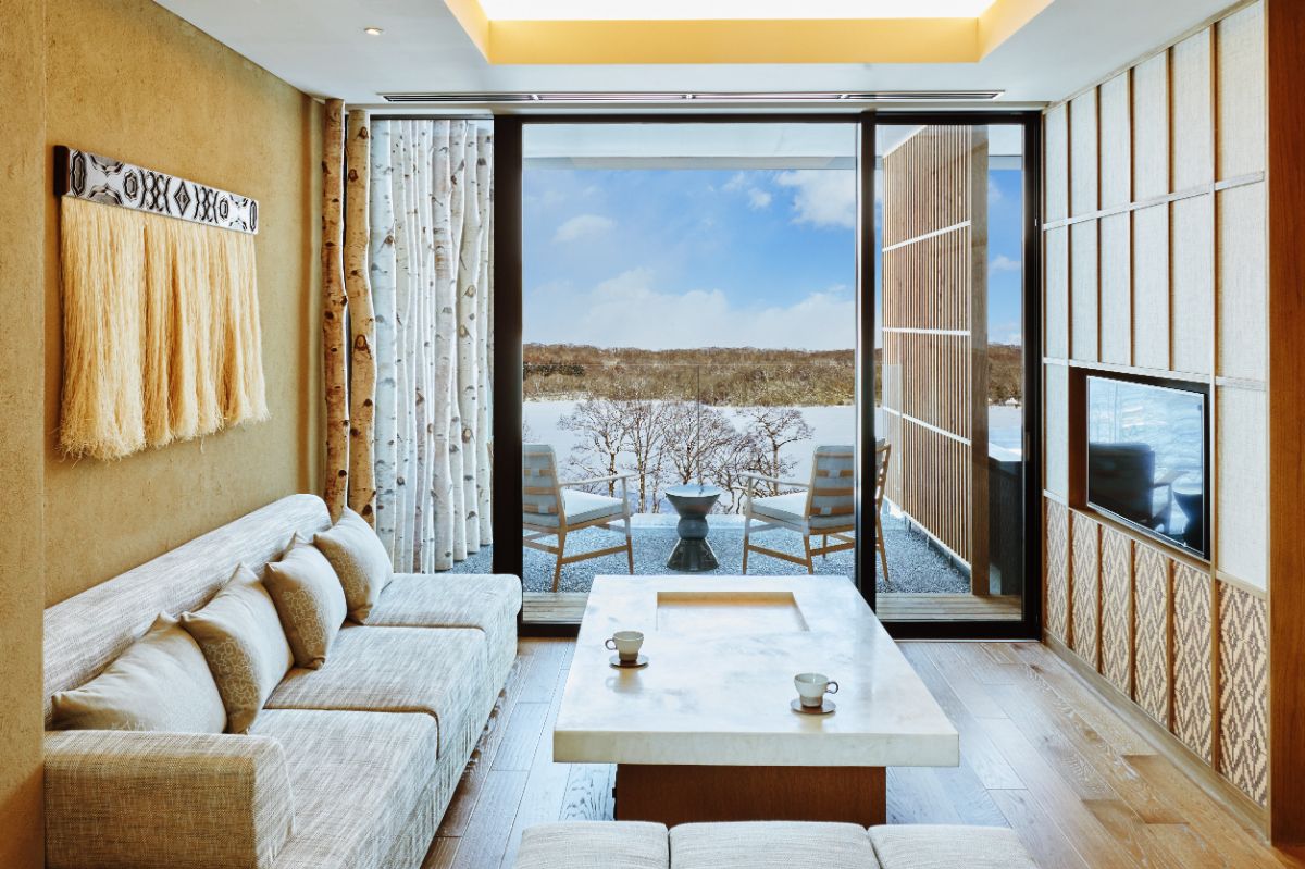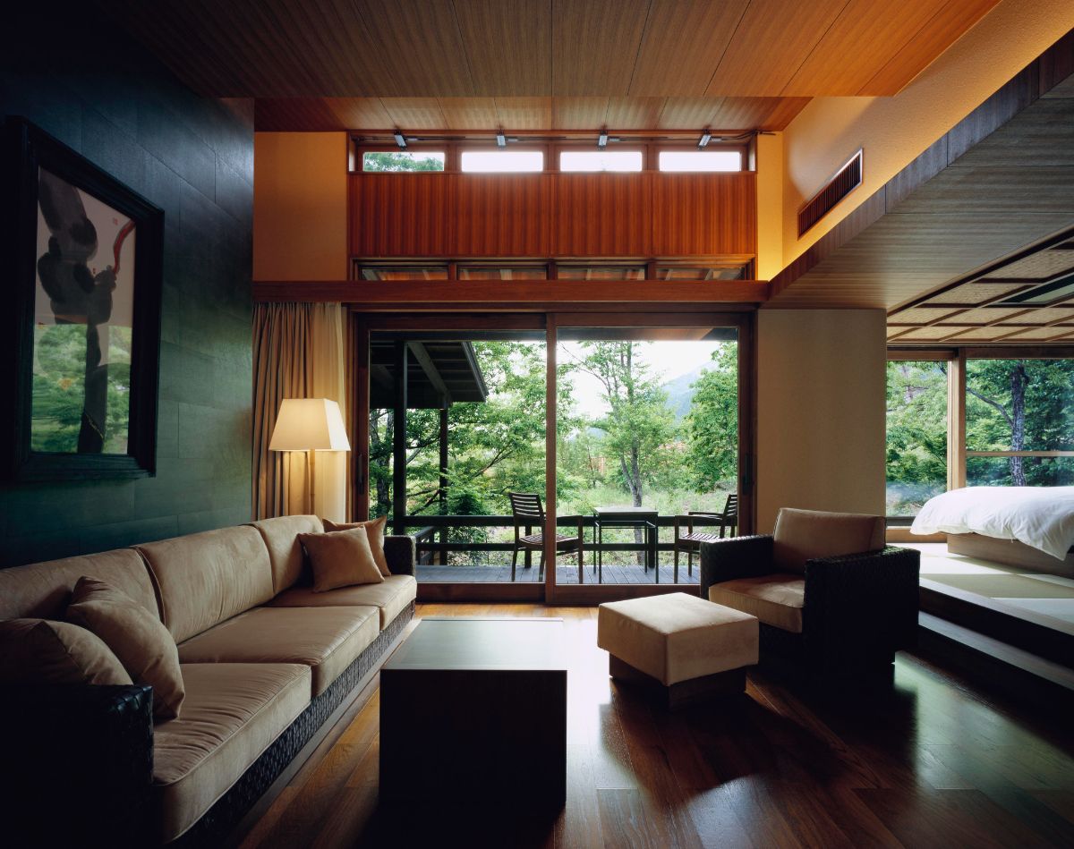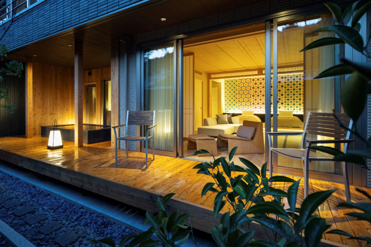 標高1000mの阿蘇くじゅう国立公園内に位置し、8000坪の敷地にわずか12棟の露天風呂付き離れが点在する温泉旅館です。客室には、溶岩を材料に用いた茶器や、小国杉(おぐにすぎ)のテーブルなど、阿蘇のカルデラが育んだ自然素材をインテリアとして取り入れています。客室のテラスに設けられた露天風呂では鳥のさえずりを聞きながらの贅沢な湯浴みが楽しめます。