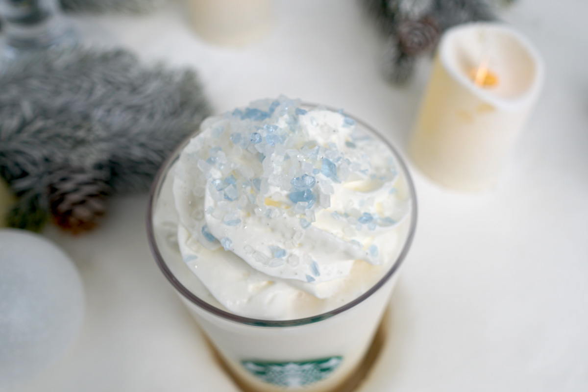マカダミアホワイトチョコフレーバーソースを使ったフラペチーノには、イギリスの伝統菓子ホワイトチョコレートファッジ(※)が入っています。トッピングには、ホワイトとライトブルーのクラッシュキャンディ、シルバーシュガーが振りかけられて、ふわりと初雪が舞い降りたかのような美しい見た目に。