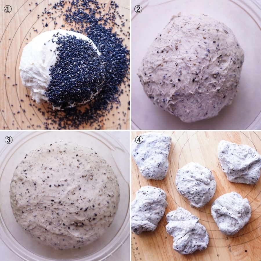 ②大きなまな板等にのせ、延ばすと膜が張るまでこねたら、太白ゴマ油と黒ゴマを加え、さらに混ぜます。丸めてボウルに入れ、濡れ布巾をかけて一次発酵させます。