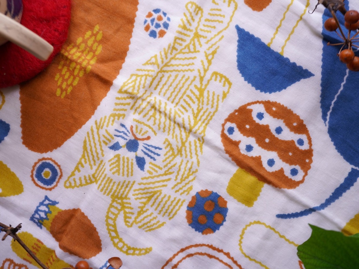 きのこや大好きなネコチャンや色とりどりのきのこが所狭しと並んだこちらの大判クロスは秋のお気に入りの一枚。