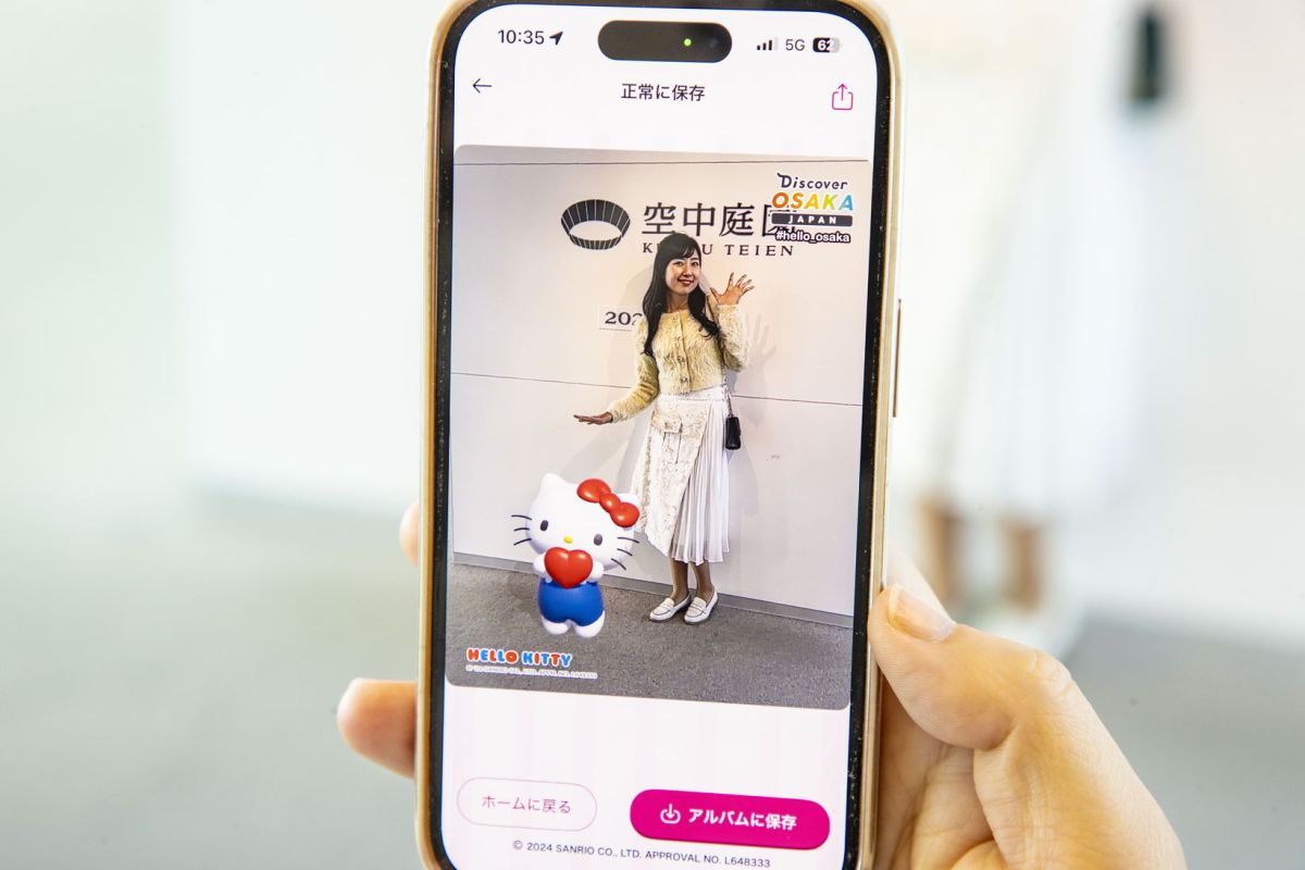 DiscoverOsakaアプリをダウンロードして、観光地やランドマークの指定スポットにアプリのカメラを向けるだけでハローキティと一緒に写真を撮ることができます。