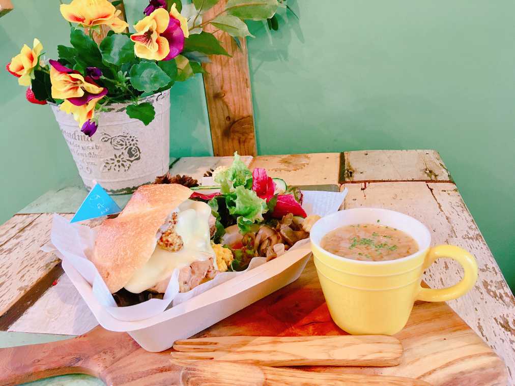 ランチメニューの「ピクニックlunch」(1620円)は、クリームチーズが入ったカボチャのサラダにジューシーな鶏肉と、とろーりチーズのコンビネーションが絶品のサンドイッチと、キノコのマリネ&サラダのセット!