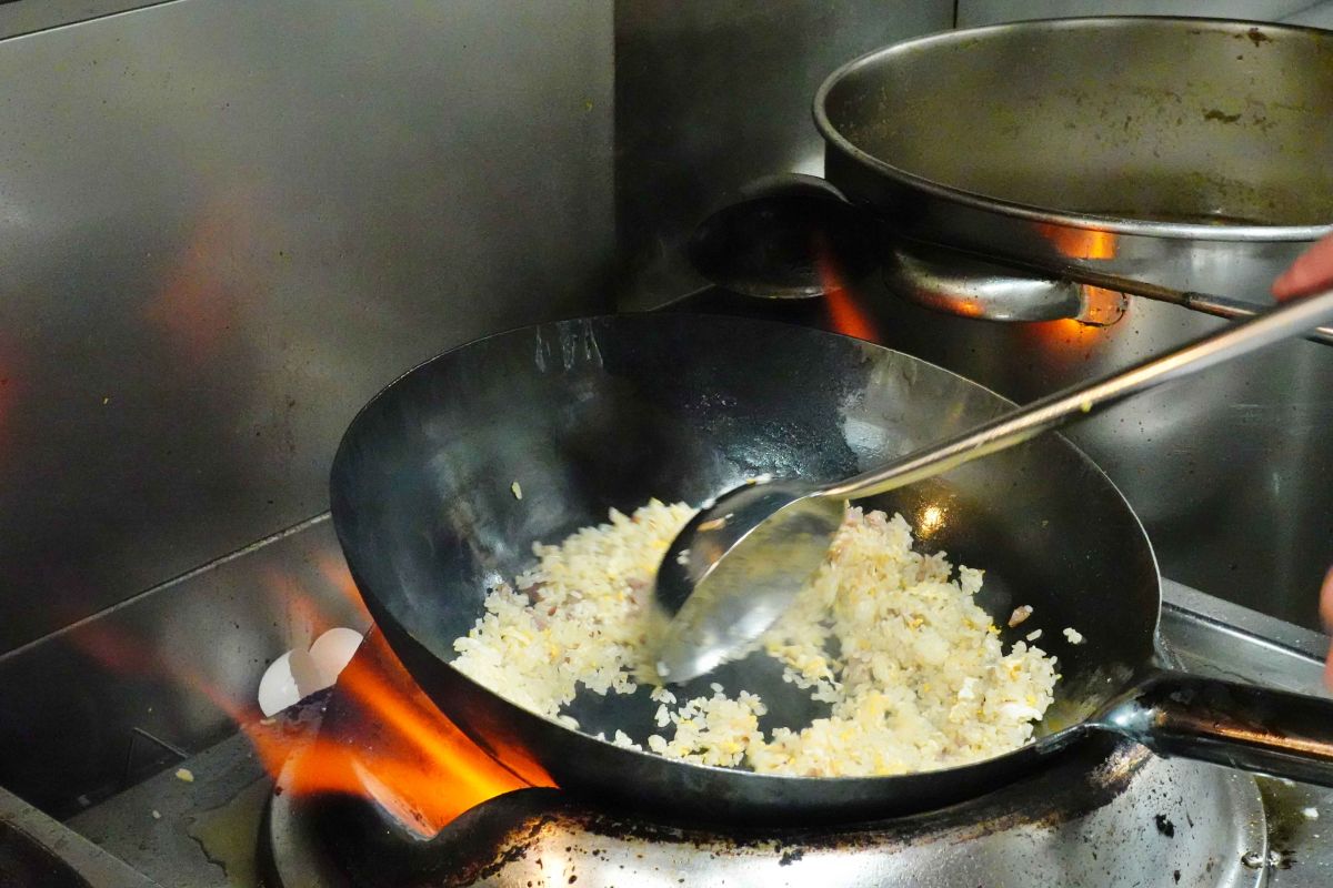 たっぷりのラードを使い、強火ですばやく炒めることで、米の表面をコーティング。これにより粒立ったパラパラのチャーハンができるのだといいます。