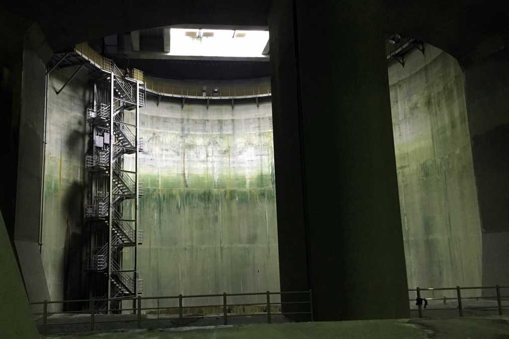 水を各施設から取り込むための立坑は全部で5つ。第1立坑は、深さ約70m、直径約30mの巨大な円筒。実は見えている部分はほんの一部で、この下に50mほど隠れています。写真だと伝わりにくいですが、スペースシャトルがすっぽり入るサイズ感。水がうねりを挙げて入ってくる様子を想像すると身震いします。