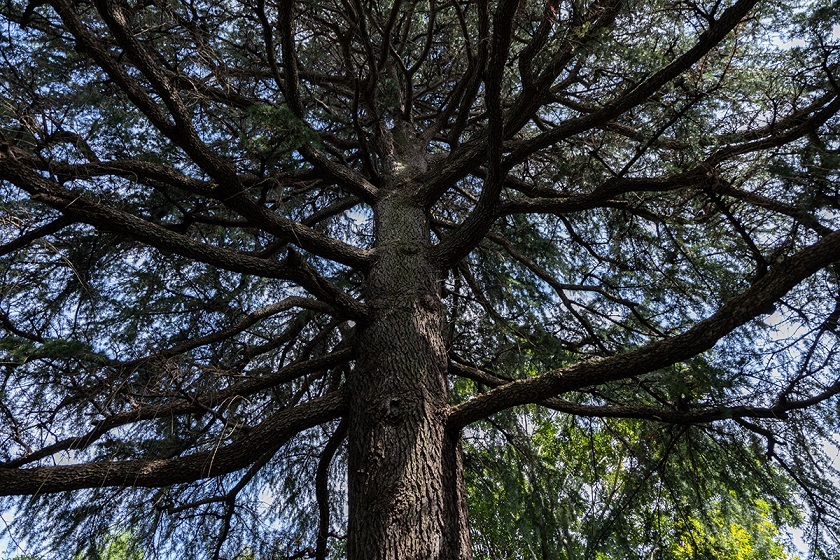 玄関を正面に見て、左奥にあるヒマラヤスギの姿も圧巻です。「鳩山会館」を建築する前からこの場所にあったという樹齢100年を超えた巨木を見上げていると、都会の真ん中にいることを思わず忘れて、その雰囲気に酔いしれてしまいます。