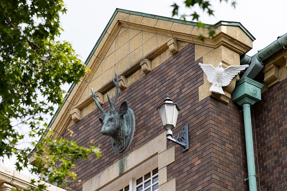 玄関の上でこちらを見下ろす牡鹿のブロンズは、じつはレプリカだそう。2005年まで設置されていたという石膏のものは、表面の銅が酸性雨で溶けて流れ出し壁面が黒くなってしまったため、取り外されて館内に展示されています。外観だけでも、ひとつひとつをピックアップして観察してみると、より「鳩山会館」への理解が深まり、興味深いですよ。