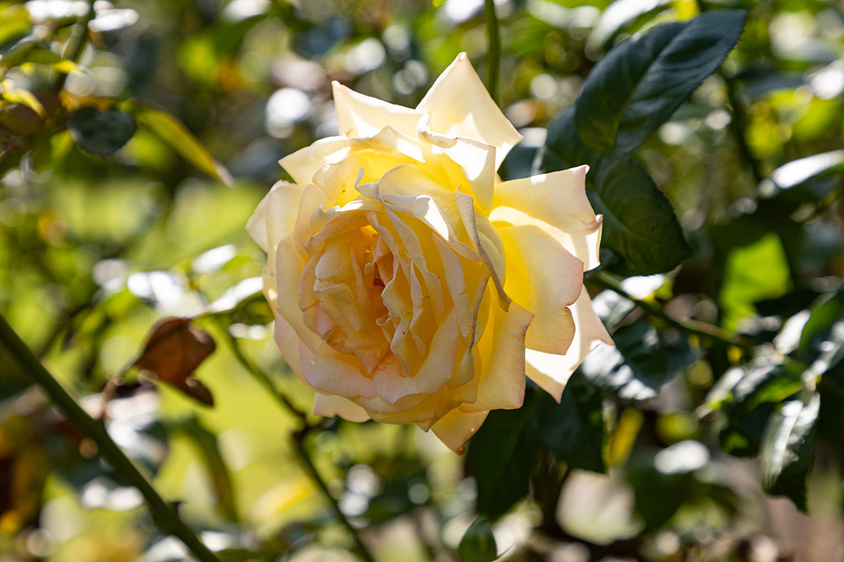 こちらも、一郎氏が好んだという「ピース」という品種。クリームイエローの花びらの先にほんのりピンクがかかっている姿が、なんともかわいらしい。20世紀を代表する殿堂入りした名花で、戦後の国際平和の象徴として世界に広まりました。