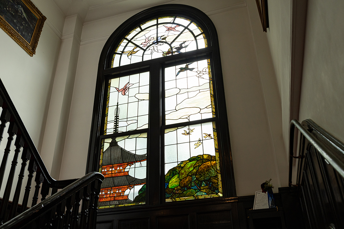 なかでも、2階へと上がる階段の踊り場部分のステンドグラスはお見事。法隆寺の五重塔の上を鳩が舞う絵柄で、山々の緑や塔の朱色の部分が立体的に見えるように彩られています。