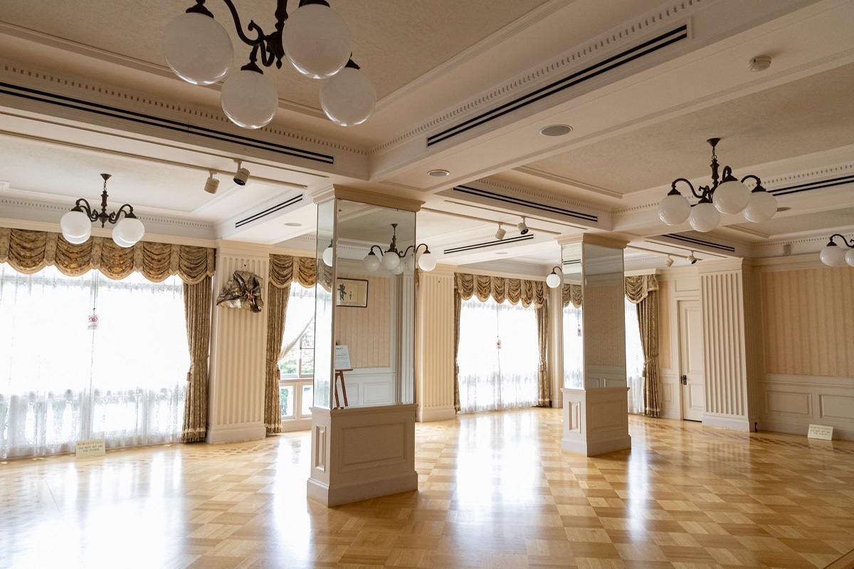 2階の大広間は、現在でも各種パーティーで利用されています。ここは、もともとは寝室だった場所で、修復の際に大広間へと改装されました。こんなに広いスペースで実際に生活していたことを想像すると、その華やかな生活ぶりが見てとれます。一面の窓からは自然光が降り注ぎ、眼下にはバラの咲く中庭を見下ろすことができます。
