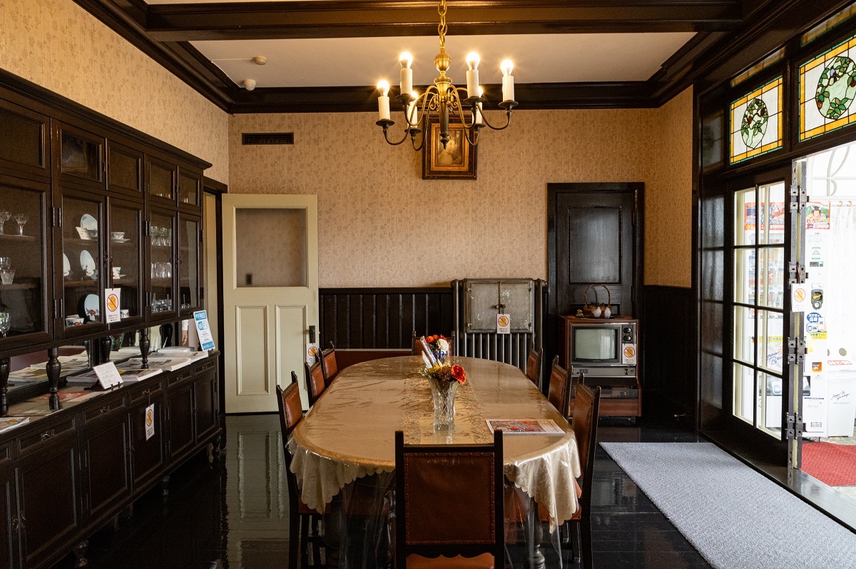 1階には、食堂やサンルーム、応接室があります。こちらは「食堂」。食器棚に、当時鳩山家で実際に使われていたという、「バカラ」などの高級な器が展示されています。
