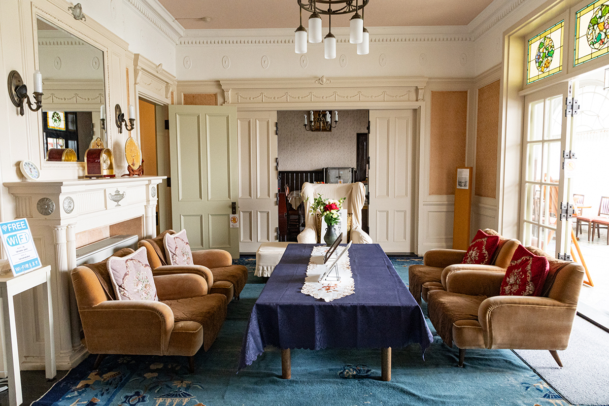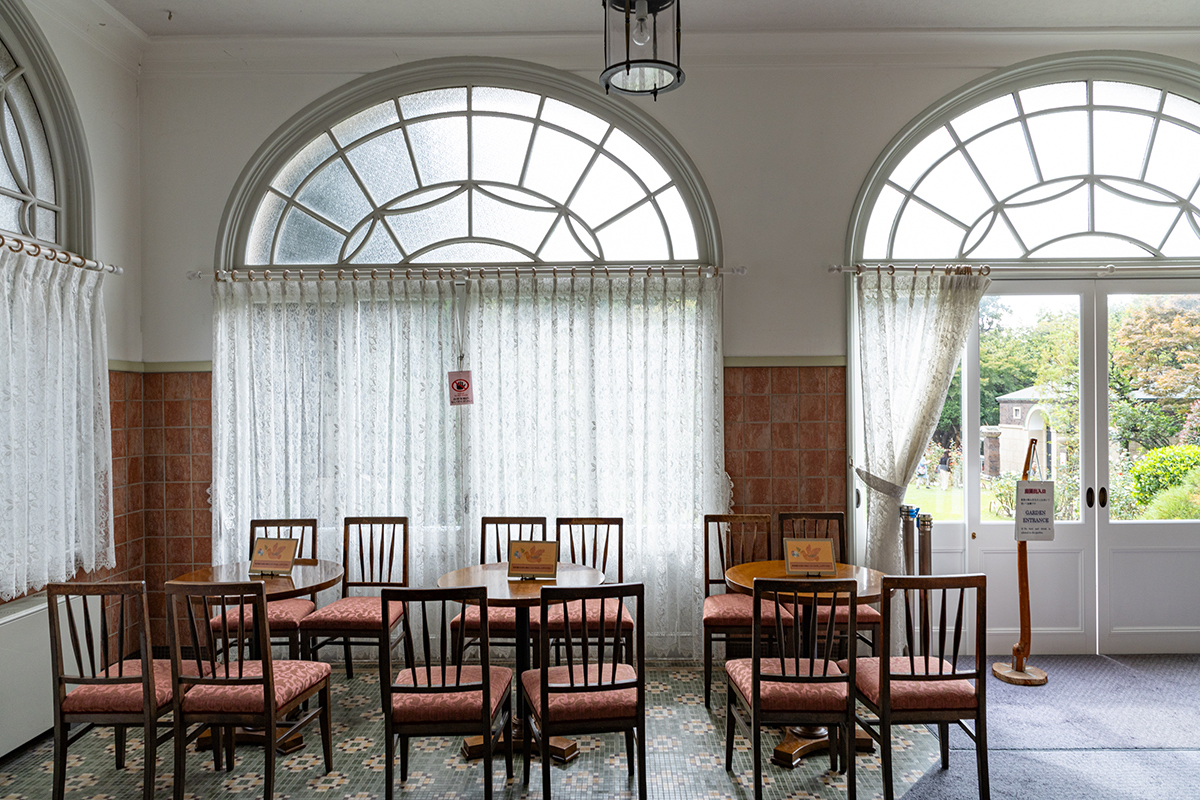 食堂を出たところには、自然光がふんだんに降り注ぐ英国風のサンルームがあります。カーテンを開けると中庭を見渡すことができ、バラが咲き誇る季節は最高。現在では自販機が設置され、椅子に座ってひと休みすることもできます。