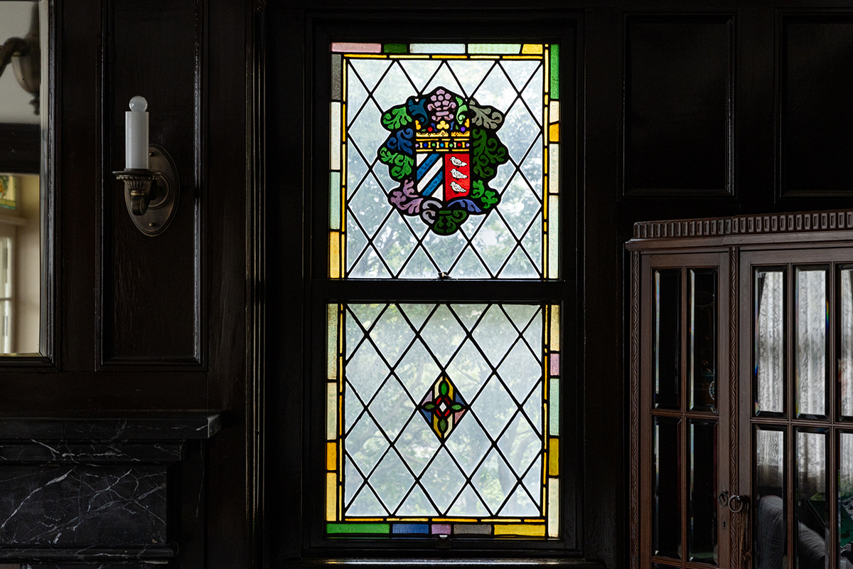 この部屋の奥にも紋章がデザインされた素敵なステンドグラスを発見。赤の部分に3匹の鳩の姿が描かれているのを見ることができます。色が付いていない部分からは、外の木の緑が映し出され、時間や季節によって移り変わる景色を楽しめるのもいいですね。