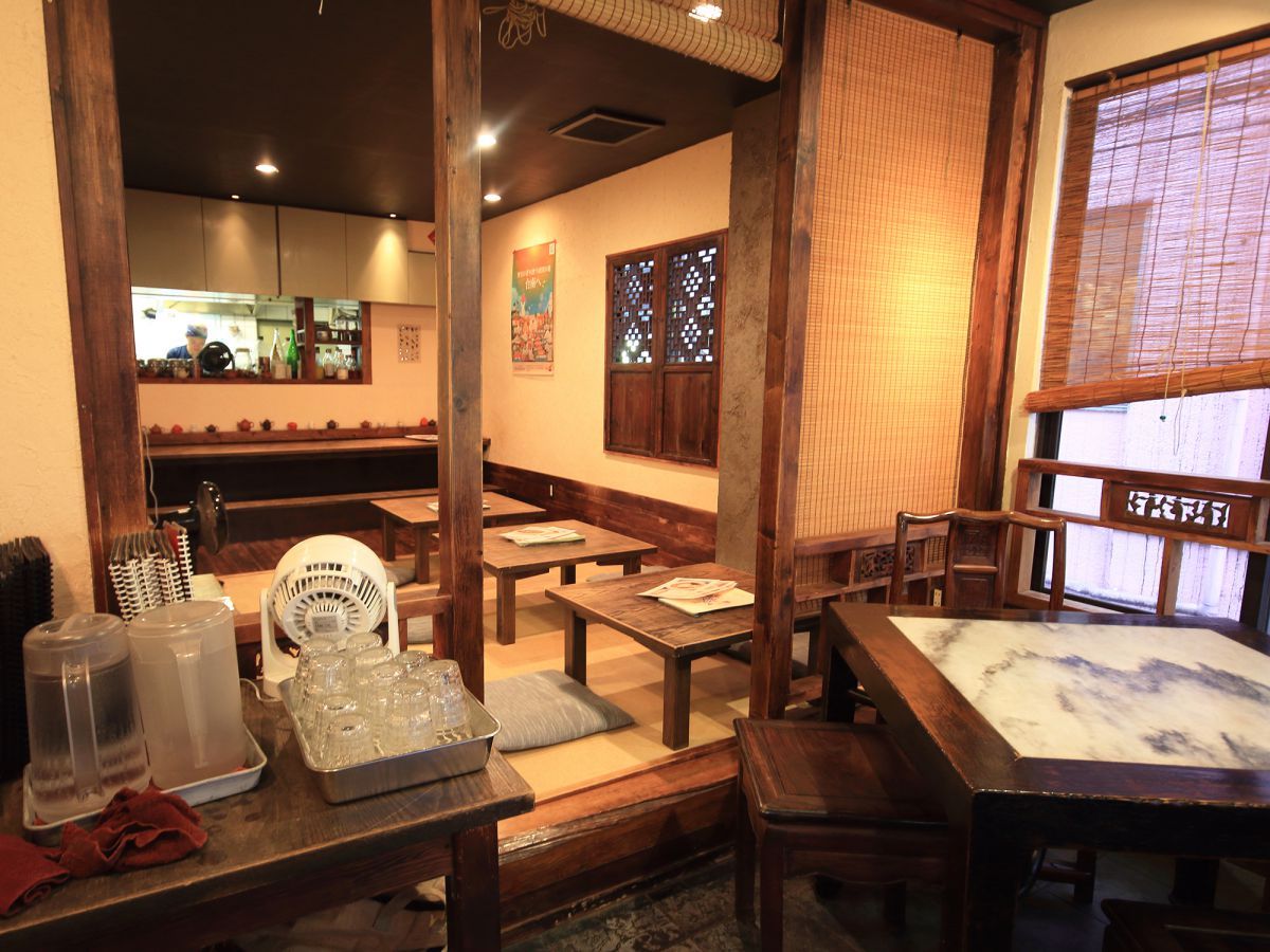 木の温もりにあふれる店内には、本国で仕入れたアンティーク調の椅子やテーブル、欄間などが配置され、台湾の茶藝館そのものの! お座敷席には琉球畳が敷かれ、たくさんの中国茶器が並べられたカウンター席もあります。