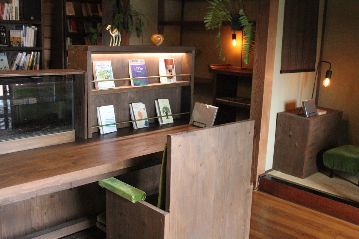 店内中央にあるテーブル席のテーブルにはメダカが泳ぐ水槽や、店主がセレクトした6冊の本が並ぶ本棚があります。ちなみに、テーブルやイスは店主がDIYした手作り品! ダークブラウンの落ち着いた色味のインテリアにも、なんだか心がホッと落ち着きます。