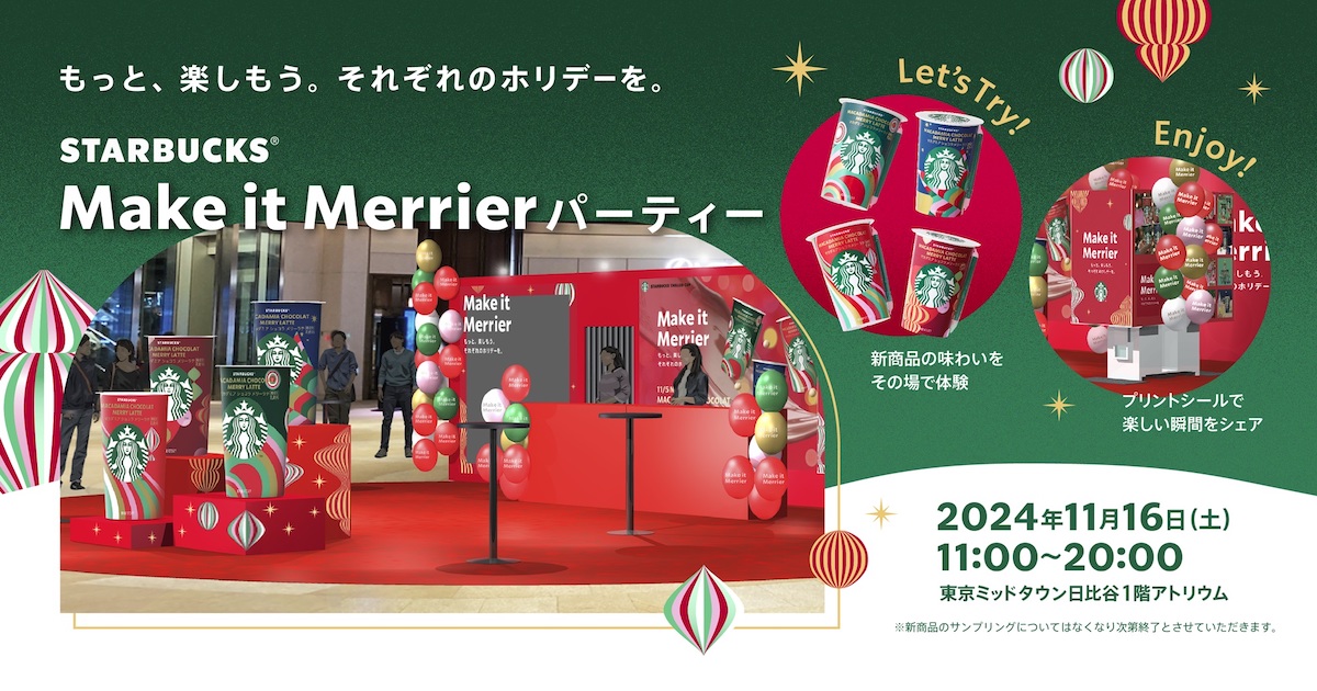 「スターバックス® マカダミア ショコラ メリーラテ」発売を記念したポップアップイベント、「もっと、楽しもう。それぞれのホリデーを。STARBUCKS Make it Merrier パー ティー」が、2024年11月16日(土)東京ミッドタウン日比谷 アトリウムにて開催決定!